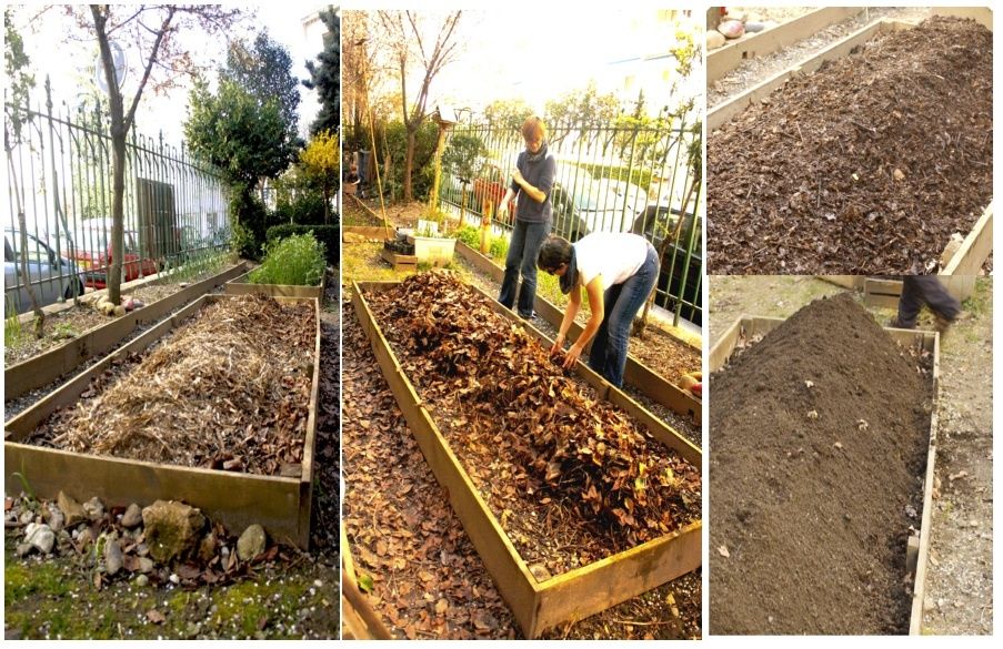 Dimanche 16 mars, nous avons construit notre première butte en utilisant du broyat de branche du jardin, des feuilles mortes récupérées dans les parcs du coin et le compost que vous avez peut-être contribué à produire en apportant vos épluchures depuis plusieurs mois. Nous avons également acheté de la terre certifiée pour être sûr de sa qualité et de l'absence de polluant.